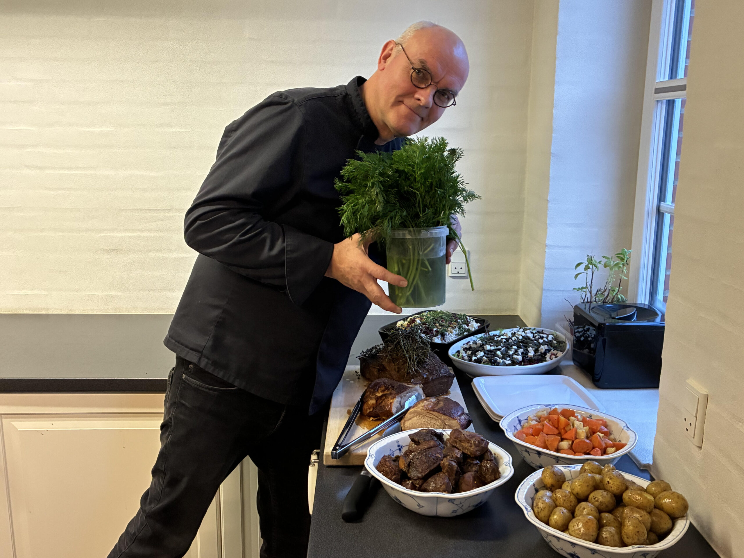 – Efter 30 år med konfirmationer og selskaber er den mest populære forret stadig tarteletter med høns i asparges. Det kan laves næsten udelukkende af lokale råvarer. Høns fra en nærliggende gård, smør fra et lokalt mejeri og grøntsager fra producenter i området. Selv asparges kan erstattes med lokale skorzonerrødder, også kaldet fattigmandsasparges, fortæller han om retten, som også er en af hans egne livretter.